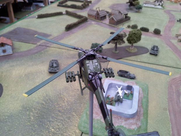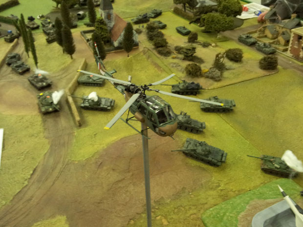 PPR flak was intense and the SAM site still functioning. A Hunter jet made an excellent bomb run on the SAM site before being shot out of the sky. Annoyingly for NATO they just could not land the knockout blow on the SAM site. In the midst of all this chaos in the sky a Soviet supplied Mi24 Hind gunship sneaked in under the NATO air umbrella. This was a formidably armed machine and immediately successfully targeted a Challenger tank.