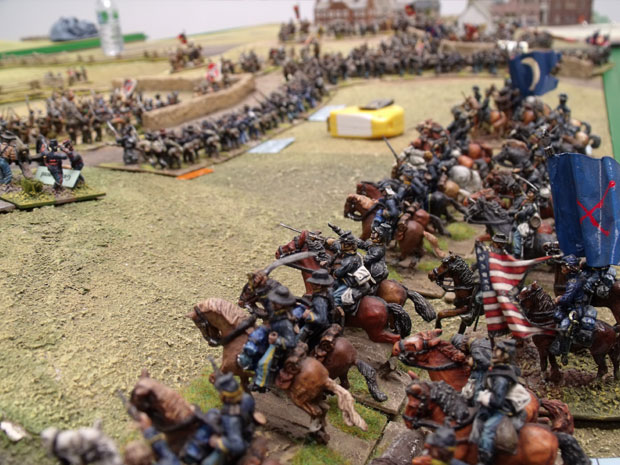 Now was the time for the Union to commit all their reserves, the gun line strengthened, Sedgewick, (who had been held in reserve all day) stepped up onto the ridge and opened fire on to the luckless cavalry. The firing was so intense that a whole brigade seemed to disappear. The rest of the Cavalry retired out of close range and a desultory exchange of fire began to take place.