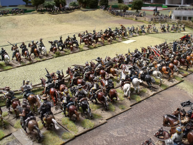 The Confederates believed their chance was to take cemetery ridge with the massed cavalry charge along with infantry support. Once again they stormed the bloody Angle and pushed up on to the Ridge, again they were thrown back. The first brigades of Reb cavalry closed on the Union line, and the very first brigade checked, pulled up then retreated out of close range. The brigade beside this passed them and smashed into the Union line, pushing the blue clad infantry back. On came the rest of Stuarts cavalry.