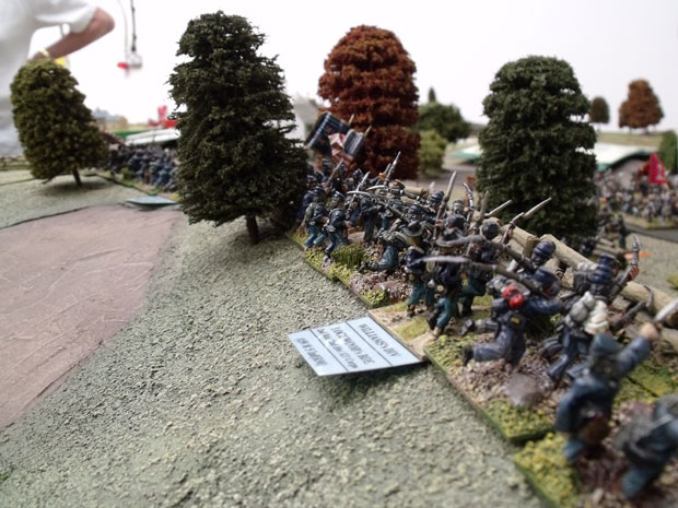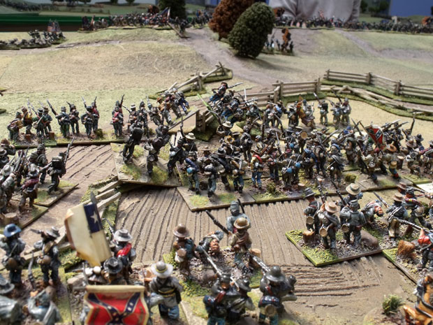 Over on the Confederate right opposite the Angle the Divisions of Ewell’s Corps were pressing on, the terrain mean’t that they were coming in on a narrow front, but these were some of the best troops with many Crack and Veteran troops in their ranks.
