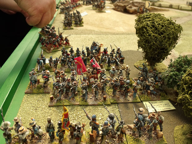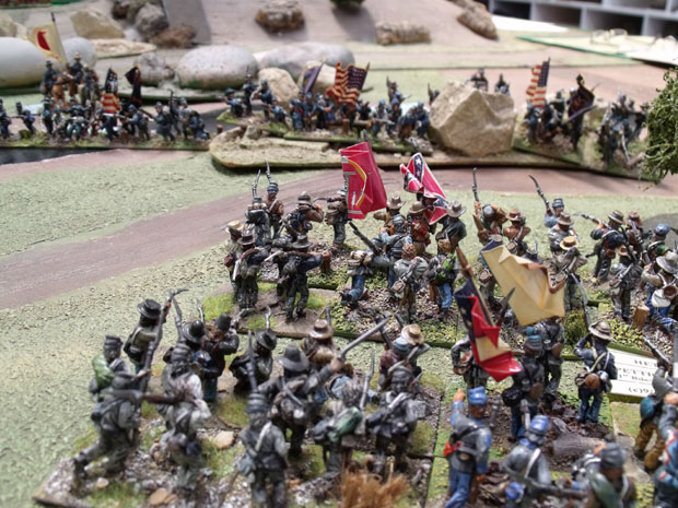 Over on the far right of the Confederate line opposite the round tops the Union again descended into the Den and began exchanging Volleys with the troops in Hill’s Corps, the exchange here became very bloody with Hill giving ground gradually.