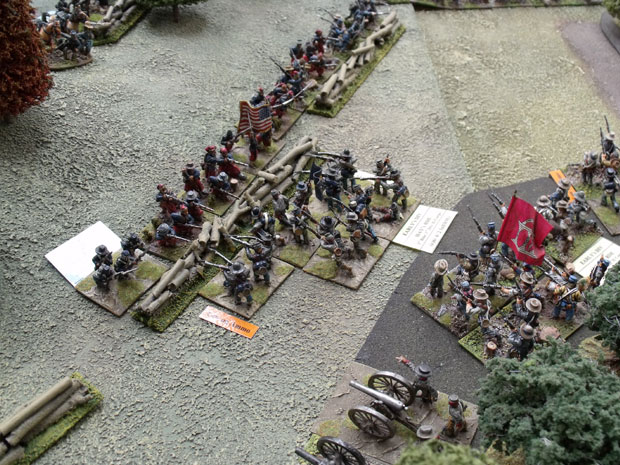 Meanwhile over in Devils Den, the Wheat field and the Peach Orchard, the battle raged on. Sickles Corps was conducting a desperate last stand while the Union’s I and V Corps pressed on in support. A.P.Hill was suffering something of a bloody nose, but his boys were pressing home the attack, pushing the Union III Corps back on it’s supports.
