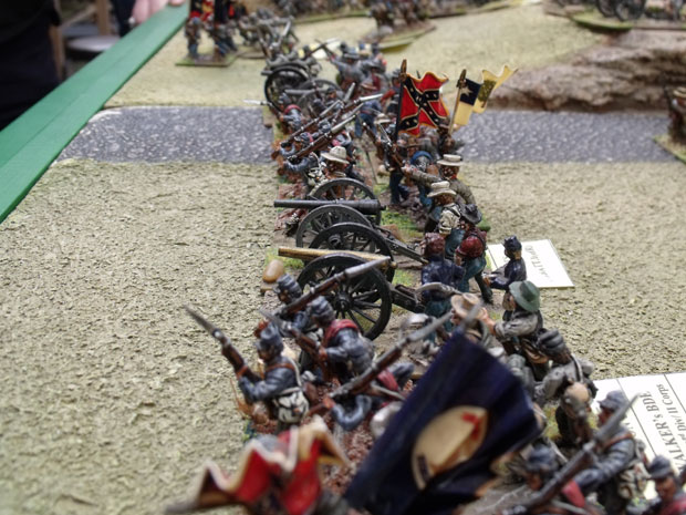The opening salvo’s from Cemetery ridge cut great swathes through the Confederate troops, the inferno of Cannon fire depleting the batteries ammunition on the ridge very quickly. So much so that three of the batteries had to stop firing to replenish their supplies. This wasn’t a problem though as the reserve batteries then took up the fight. The chap controlling the Cemetery ridge had a tremendous amount of luck, rolling “9” and “0”’s in rapid succession, causing the Rebs to remove two stands at a time from their Brigades. On the Rebs came, very much in the style of Pickett!